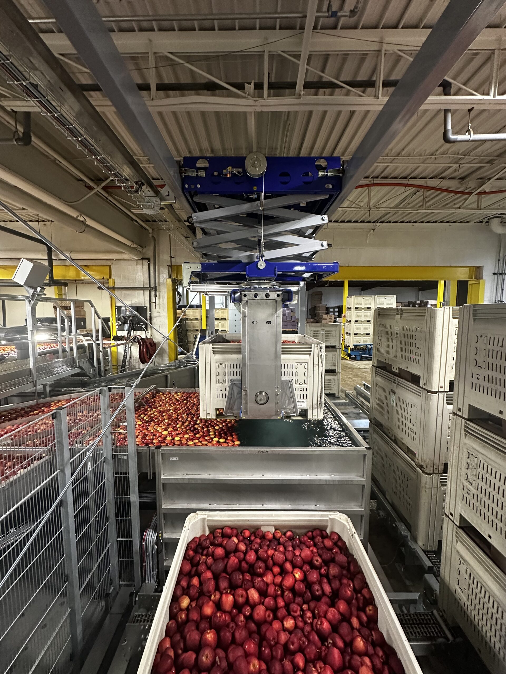This project involved the complete redesign and automation of the front end of an existing fruit packing line to improve flow control, increase grading precision, and enhance overall operational performance. From the moment a bin enters the dumping system to when fruit is delivered to the grading line, the entire process is fully automated. The system incorporates robotic bin dumping, automated empty and full bin handling, integrated bin de-stacking and re-stacking, wet dump technology for gentle fruit handling, split-flume water management, pre-sort with wet rot removal, leaf removal, and controlled fruit distribution through flume dividers. The all-electric design eliminates hydraulics while maintaining a low overhead clearance and compact footprint. Delivered as a turnkey solution, the system arrived pre-wired and fully integrated with customized electrical, programming, and control systems, resulting in higher efficiency, faster changeovers, reduced labor dependency, reduced downtime, and a cleaner, more consistent operation.